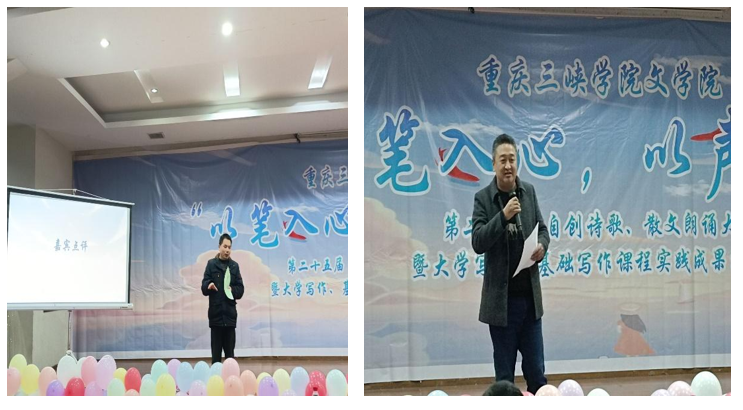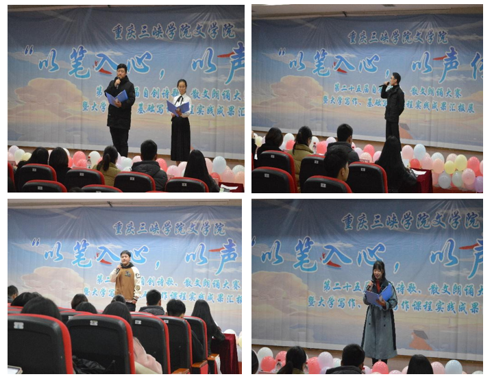 自创作品,用笔墨书写真心;自我朗诵,用声音传递真情。2021年12月16日永利3044noc第25届自创诗歌、散文朗诵大赛暨大学写作、基础写作课程实践成果汇报展在明辨楼2-104举办,永利3044noc领导班子及部分教师代表共同出席本次大赛并担任大赛评委。《大学写作》授课教师严小红和《基础写作》授课教师邢文、辅导员刘林精老师全程指导并出席此次大赛。