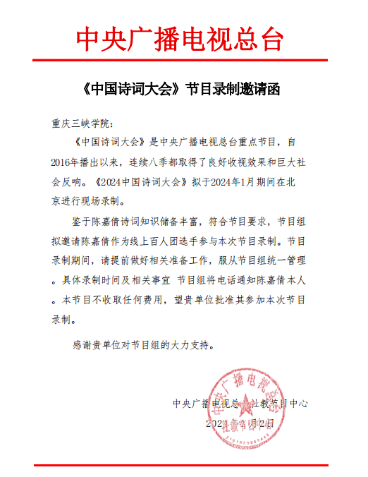 近日,永利3044noc传来喜讯,2021级汉语言文学(师范)4班的陈嘉倩同学成功入选《2024中国诗词大会》线上百人团。“中国诗词大会”是一档由中央广播电视总台原创的大型文化节目,节目以“赏诗词之美、寻文化之根、铸民族之魂”为理念,唤起人民群众对传统诗词文化的浓厚兴趣,在全国范围内掀起了广大诗词爱好者学习的热潮。