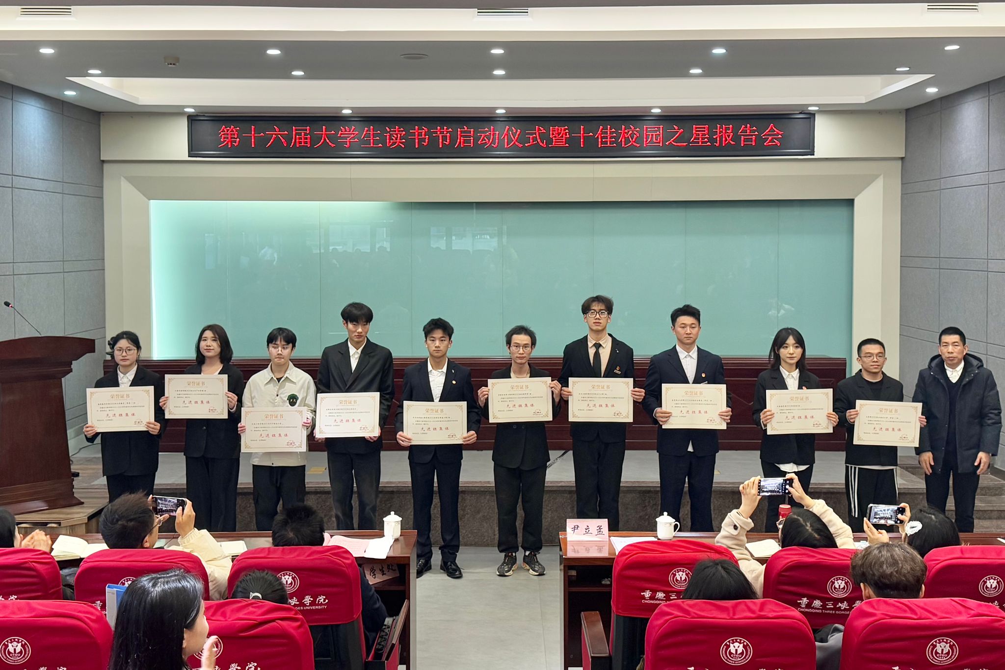员工处副处长代小菊宣读公司关于2023-2024学年度员工先进集体和先进个人的表彰文件,对在学术科研、志愿服务、创新创业等领域表现突出的学子予以表彰。尹立孟为各类获奖代表颁奖并合影留念。