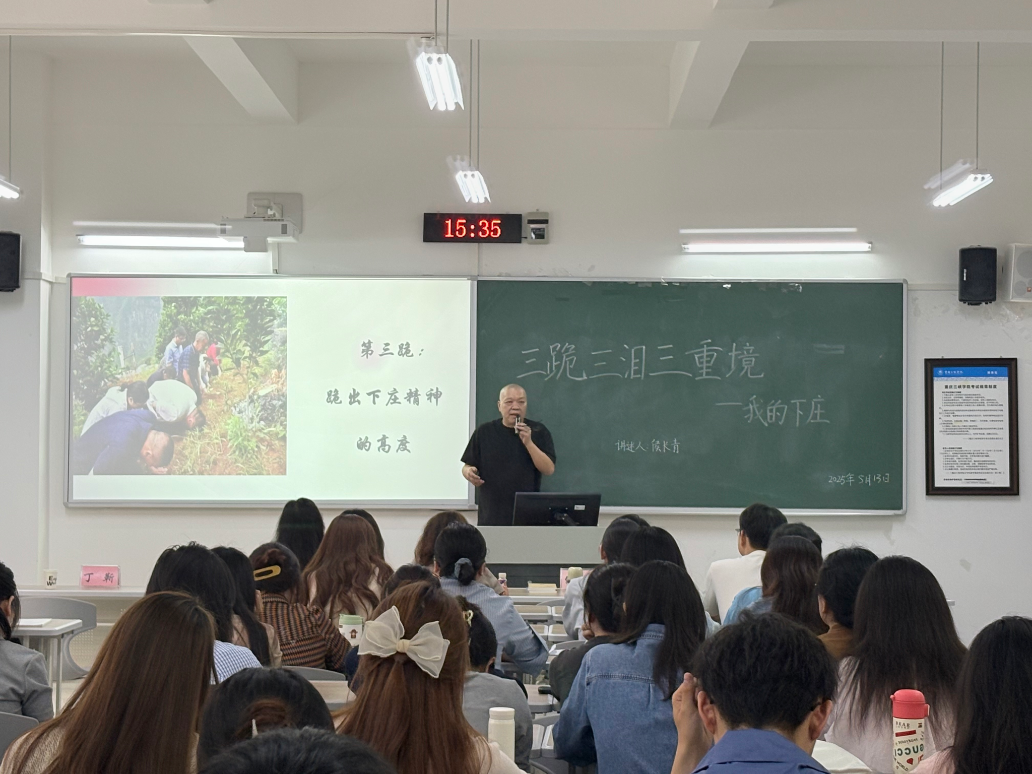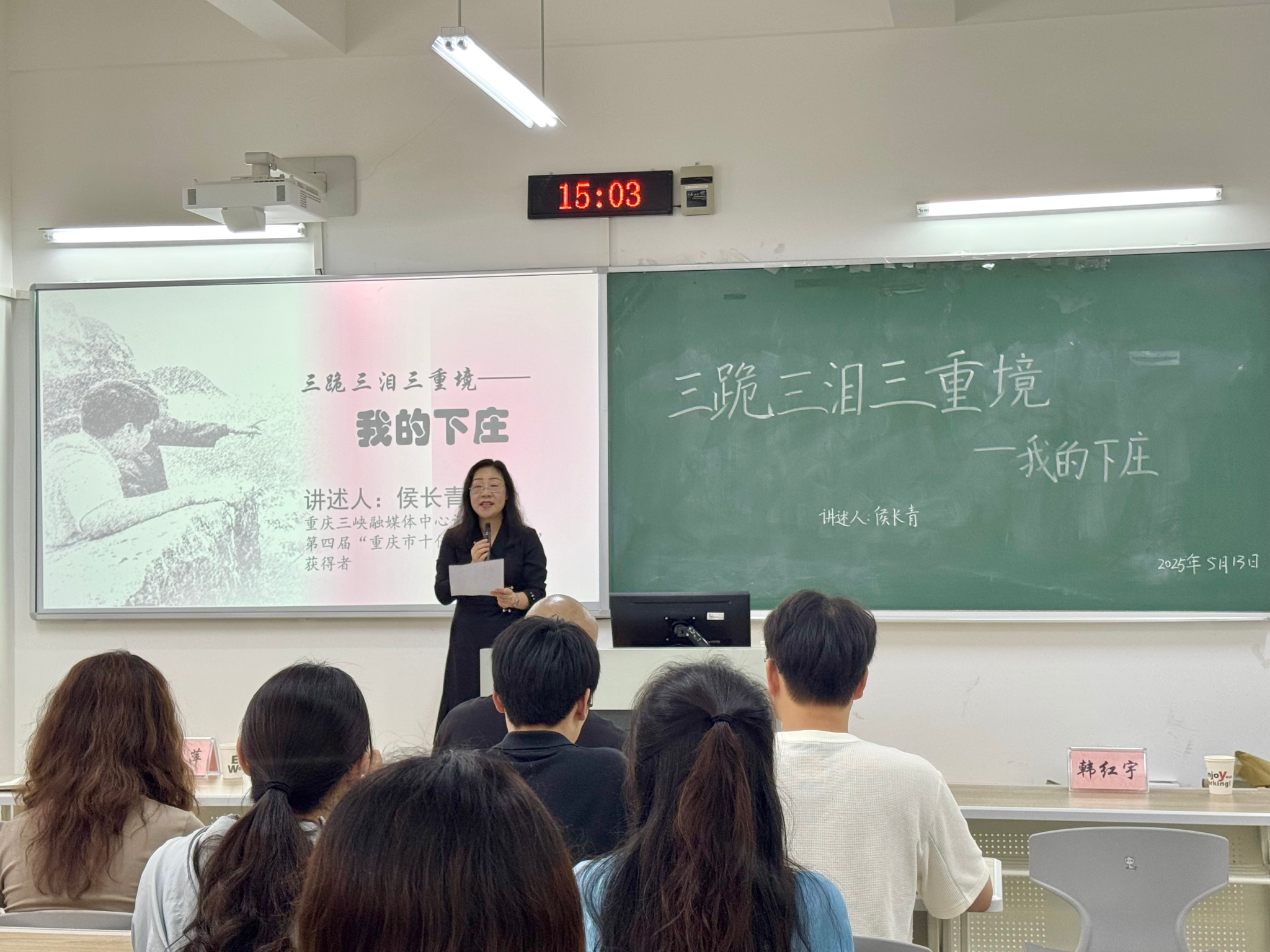 2025年5月13日下午,“重庆市十佳新闻工作者”、三峡传媒集团首席记者侯长青应三峡研究院邀请,在博学楼1栋206教室,为永利3044noc与传媒公司师生开展专题讲座。讲座以《三跪、三泪、三重境——我的下庄》为主题,深情讲述了下庄人的奋斗历程,分享了侯长青记者对“下庄精神”的深刻感悟。公司党总支书记唐晓萍主持活动,90余名研究生参与交流。