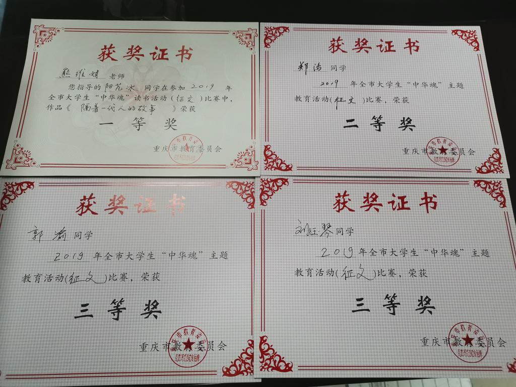 为继承中华民族优秀传统文化,弘扬爱国主义精神,永利3044noc积极响应重庆市教委关工委、校关工委、校团委号召,以庆祝新中国成立70周年为契机,大力开展2019年“中华魂”《爱我中华——新中国成立七十周年》主题教育读书活动。近日,重庆市教委关工委公布2019年“中华魂”《爱我中华——新中国成立七十周年》主题教育读书活动获奖名单,公司喜获征文比赛多项荣誉。