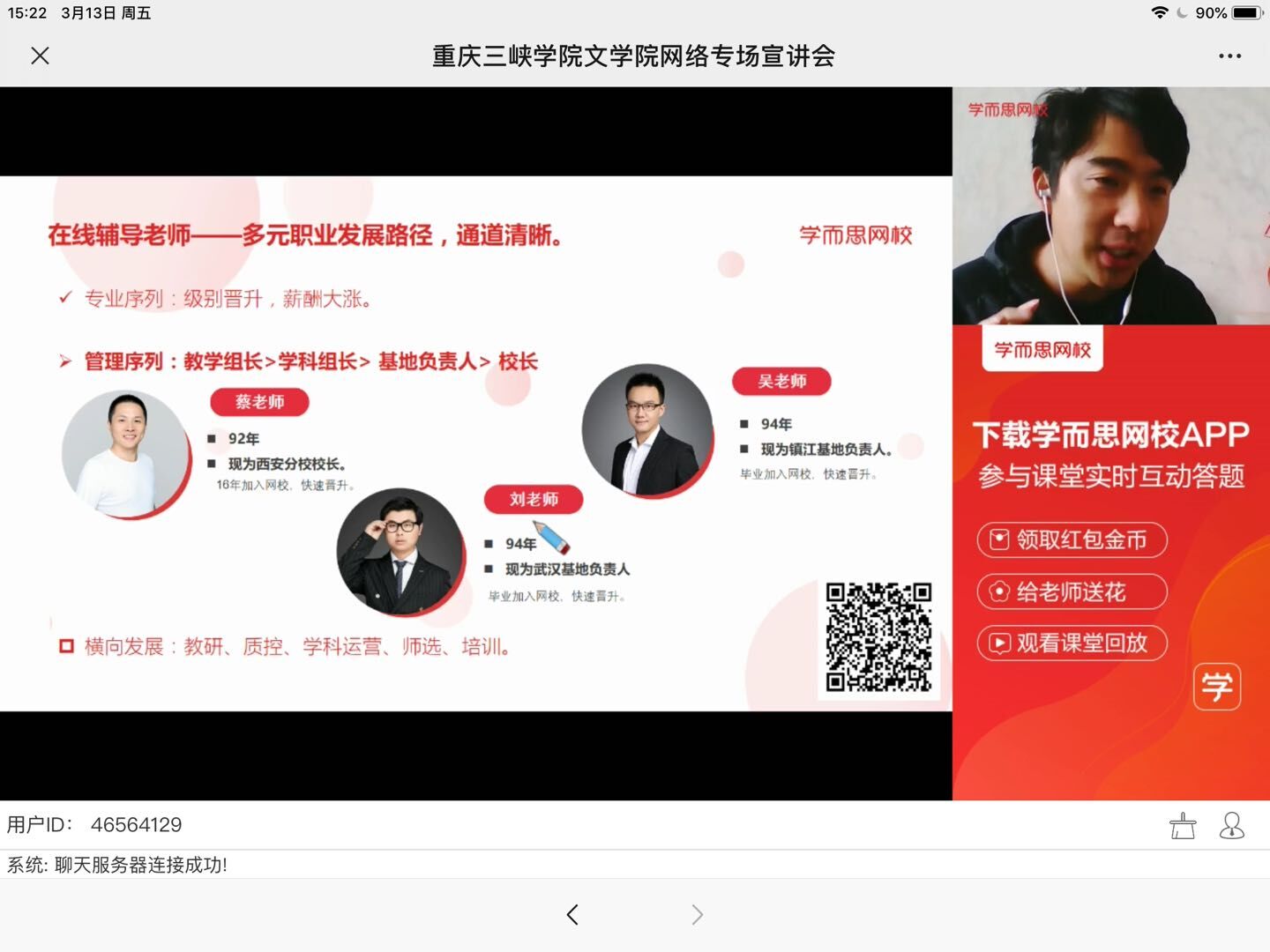 会上,张军老师首先就当前在线教育行业现状和学而思网校发展历程做了一次形象而直接的介绍,让同学们对其有一个更好的了解和认识。接着,重点介绍了学而思网校的招聘条件、薪资待遇以及员工福利等内容。在最后的交流环节中,张军老师对同学们关心的招聘问题进行了详细解答。