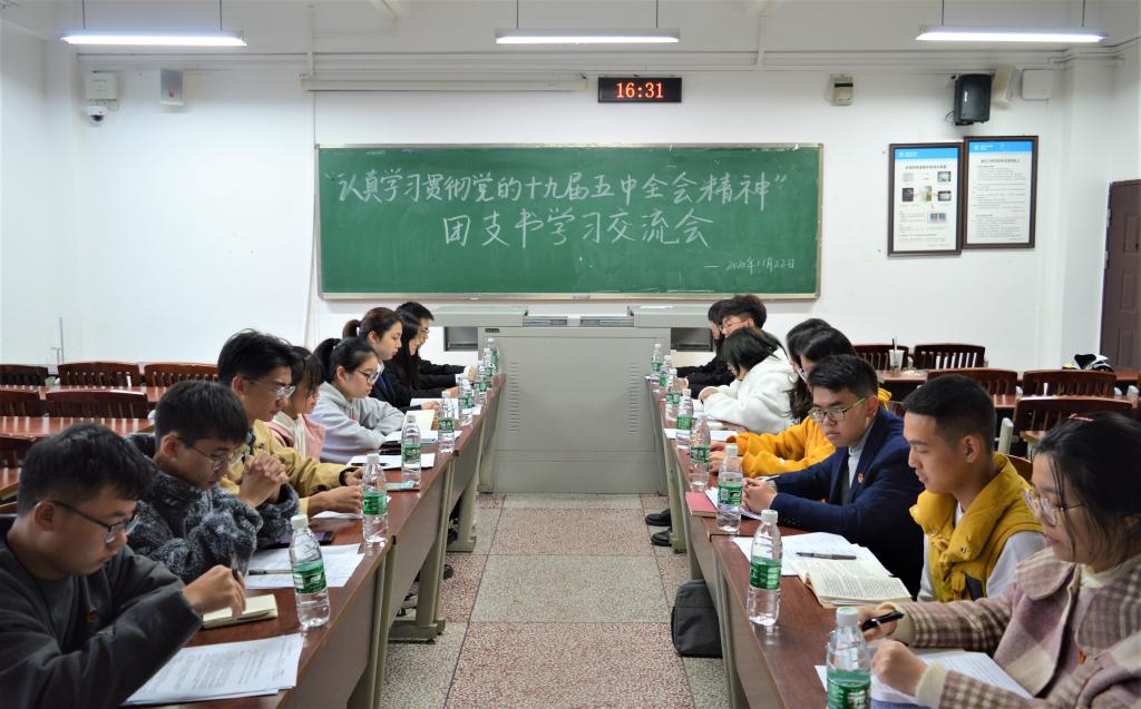 活动伊始,活动负责人廖雪行讲解了党的十九届五中全会精神并组织大家集体学习。会上,团支书们认真翻阅、学习党的十九届五中全会精神相关文件,观看党的十九届五中全会视频。接着,大家进行热烈的讨论,互相分享感想体会。在谈到关于“如何组织团员青年学习党的十九届五中全会精神”的策划与设想时,团支书郑尚军说道:“多样的活动才能调动同学们学习党的知识的积极性。我们可以通过举办团课、开办团日活动等方式组织同学学习,也可以联合其他部门举办活动进行宣传。”团支书余周城则分享了他的个人工作经验,他表示:“在平时我们要加强自身建设,抓好团员队伍工作,提供毕生力量,为实现中华民族伟大复兴贡献青春智慧。”随后,20级团支书们纷纷提出了在工作之中的困惑之处,如:怎么做好青年大学习的收取工作、如何协调班委之间的工作等。19级的团支书们则提出详细的解决方法。