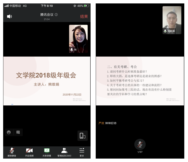 为进一步推动公司员工工作的开展,11月22日20:00公司召开了2018级年级大会,2018级全体员工参与此次线上会议,2016级部分优秀员工代表作为特邀嘉宾出席活动并依次进行发言。此次年级大会由2018级辅导员熊维娟主持。大会就2018级员工面临的各类问题进行了经验分享、感恩教育、安全教育、倡导节约四个板块的集中答疑。
