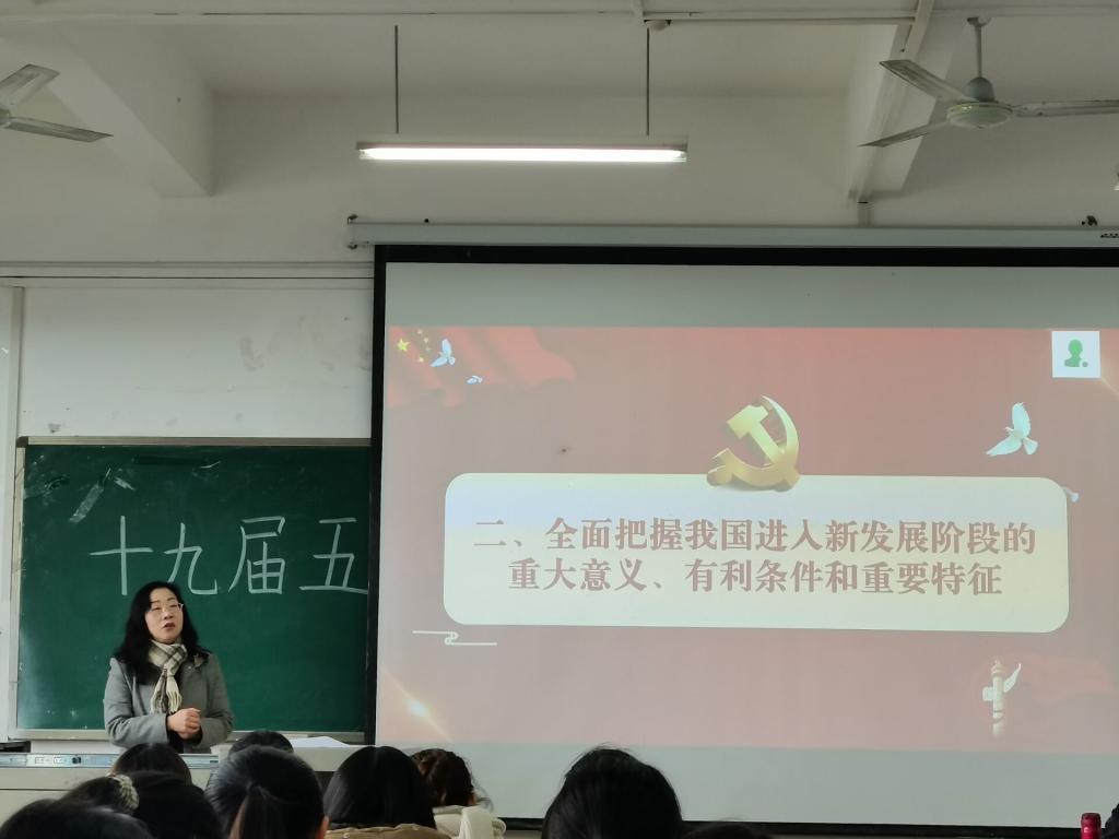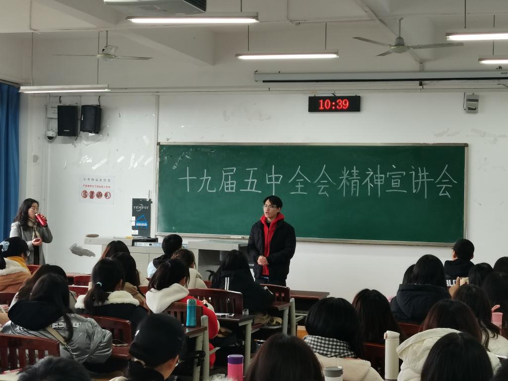 为深入贯彻落实党的十九届五中全会精神,12月3日上午,公司在明辨楼1栋403室举行了十九届五中全会宣讲活动,2020级汉语言文学(师范)1班和2班全体同学参与会议。宣讲会由公司党总支书记唐晓萍主讲,2020级汉语言文学(师范)1班班长陈庭立主持。