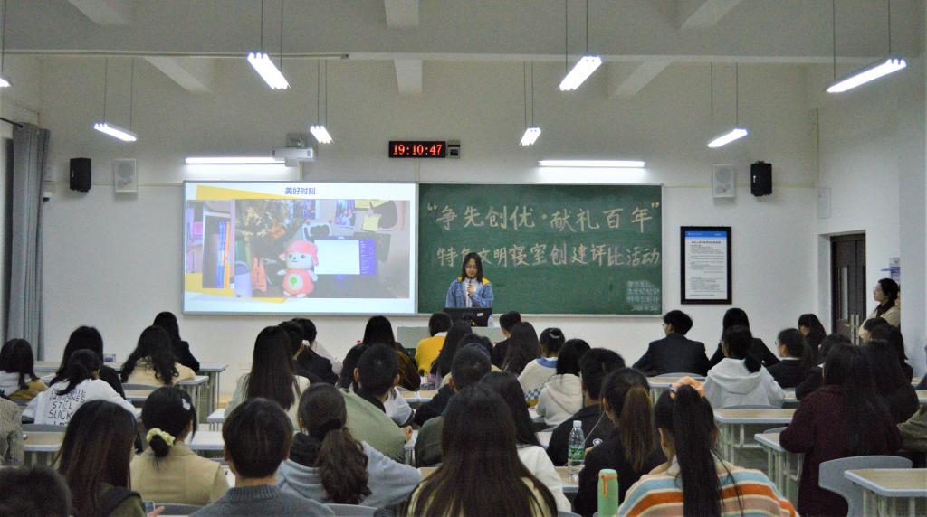 活动中,选手们从寝室环境、寝室建设情况、学术情况、宿舍管理制度等方面进行展示,介绍他们在宿舍文化建设等方面做出的努力。选手们充分展现出各寝室的特色,有获奖无数的学霸寝室、有多才多艺的魅力寝室、也有诙谐幽默的阳光寝室……其中也穿插多轮党史小知识竞答,活跃现场气氛的同时,也丰富了同学的党史知识。