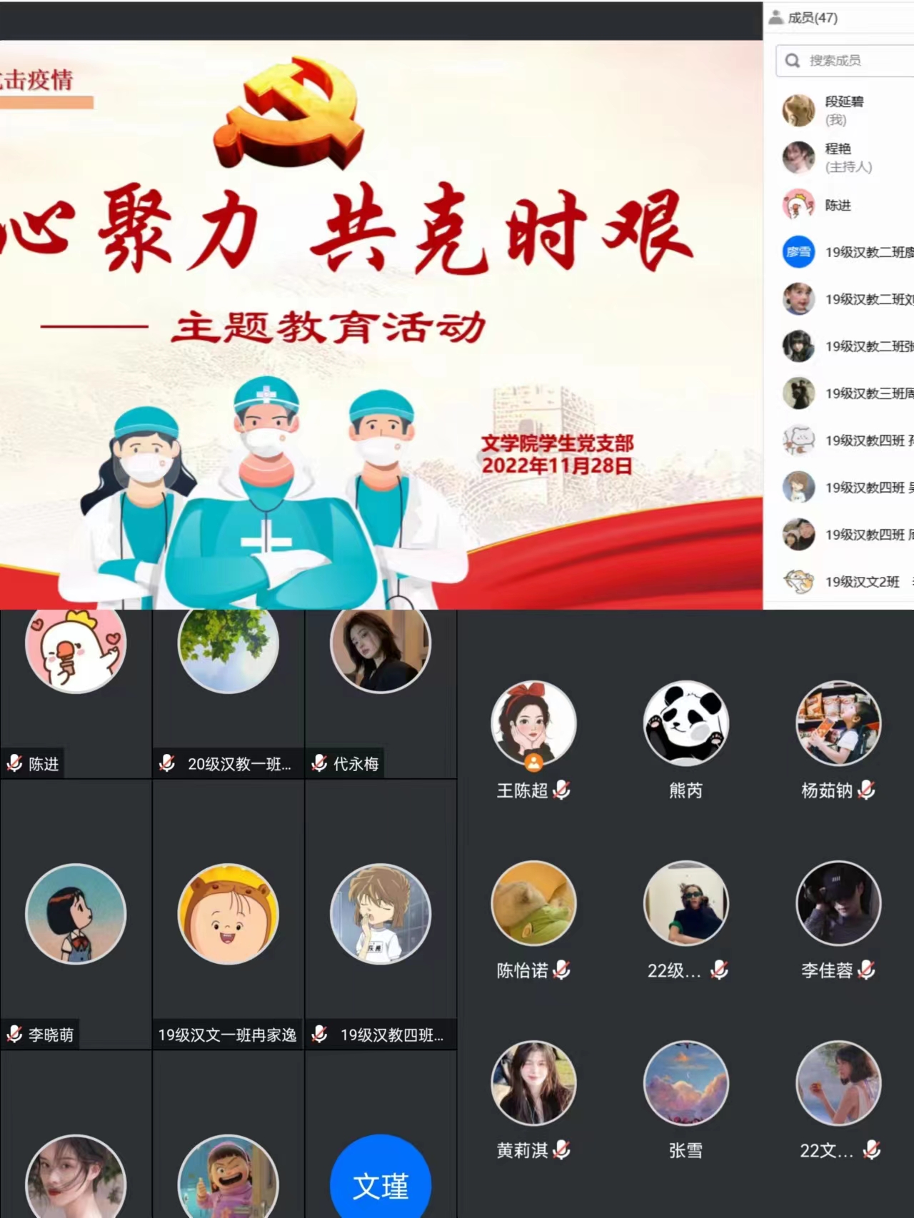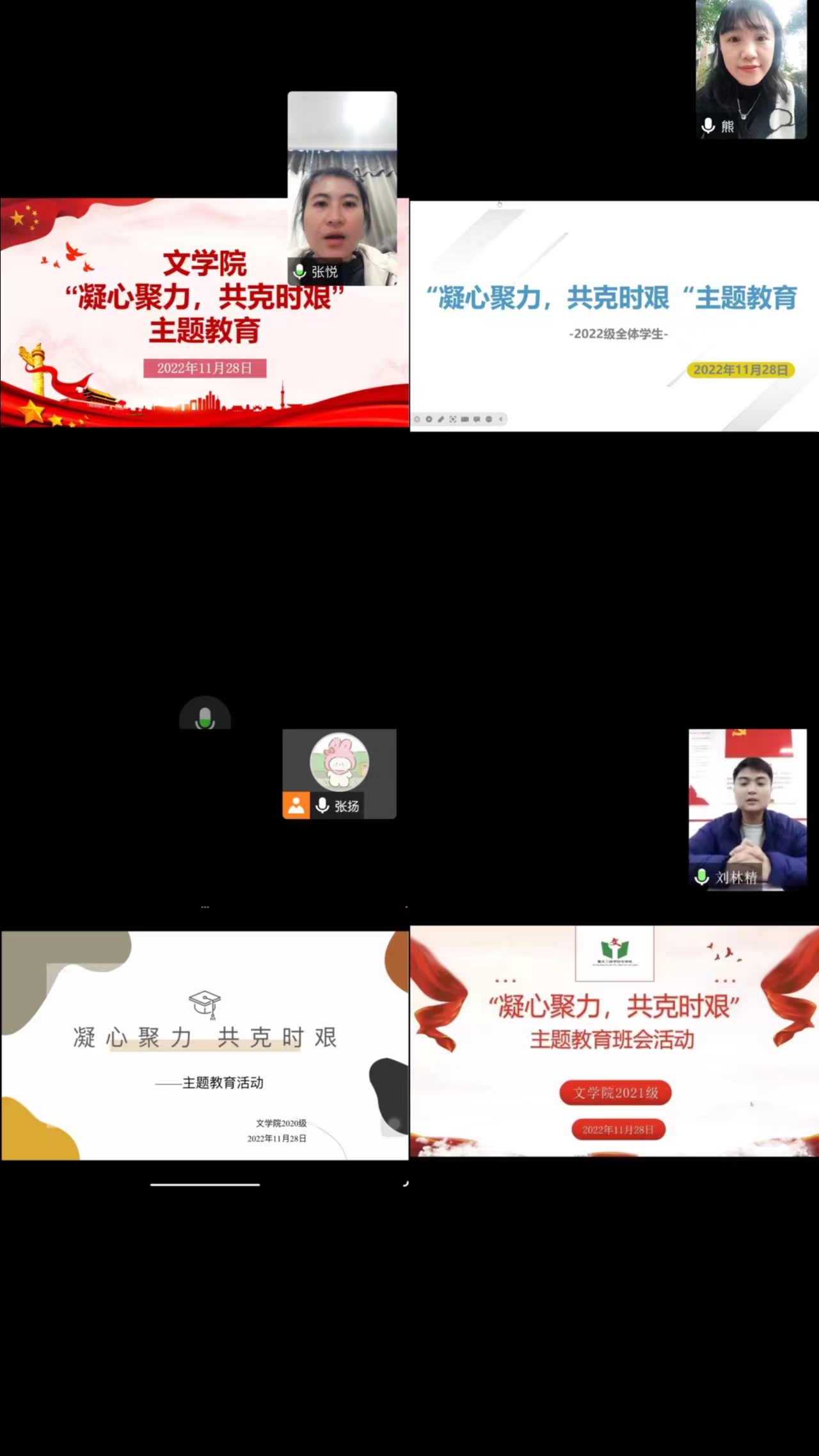 为贯彻落实公司疫情防控工作调度会精神,也为增强公司全体员工打赢疫情防控歼灭战的信心,更好地适应线上教学的生活。11月28日下午,公司各年级开展了“凝心聚力,攻克时艰”线上主题教育活动。