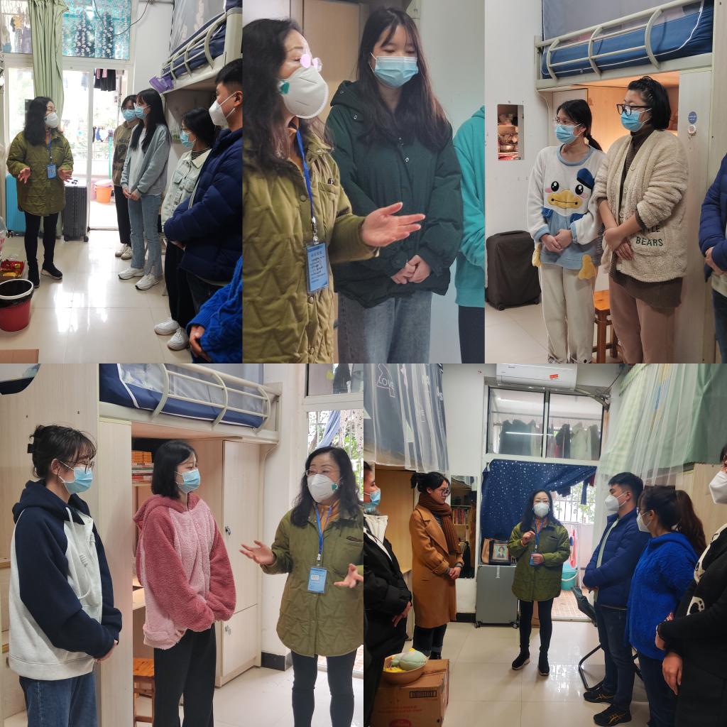 在宿舍走访过程中,唐晓萍书记首先提醒了楼长和层长们不仅要发挥带头作用,积极营造良好的宿舍学习和生活环境,还要切实走进同学们的生活,观察同学们的心理状况。其次,老师们熟悉了解同学们线上学习和生活的情况,并建议同学们要将运动与学习相结合,积极参加线上活动,实现德智体美劳的全面发展。最后,老师们还特别叮嘱同学们要严格遵守公司疫情防控要求,坚持不懈做好个人防护。同学们纷纷表示一定会谨记公司的防疫要求和管理规定,做好自我防护,并合理安排学习生活。