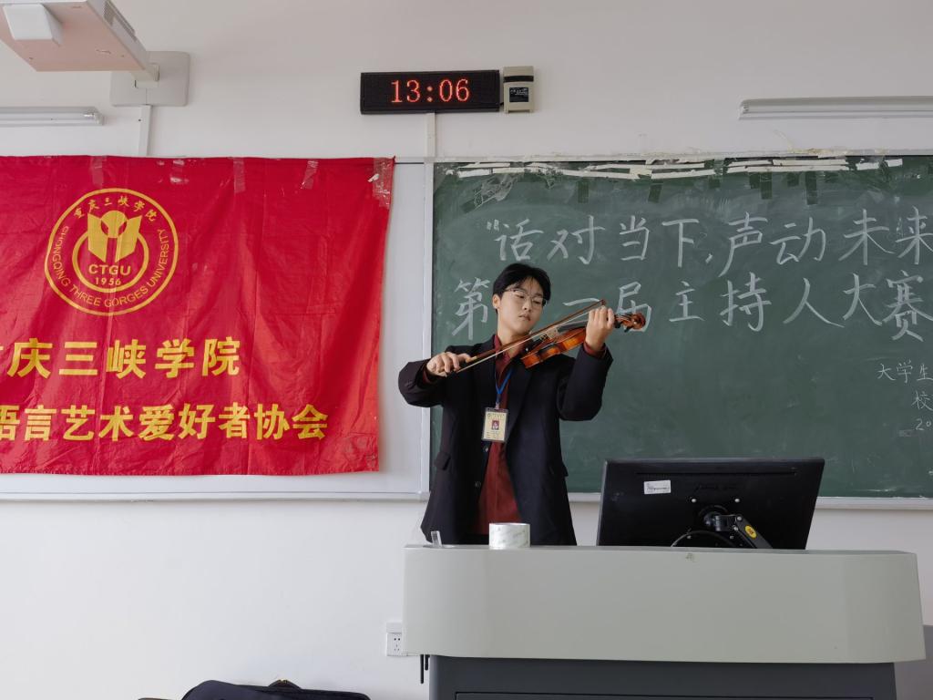 比赛伊始,选手们依次进行自我介绍与才艺展示。自信大方,各展风采,或一舞翩跹,或调丝弄竹,或婉转歌唱,带来了一场精彩的视听盛宴。接着,各选手自选内容进行主持。内容丰富,涵盖广播电台、迎新晚会、企业晚会、气象播报等。在比赛中,由语协会长陈欣欣、副会长鲜萱、陈沛洁和部长彭睿、马鸿滟、胡奉森组成的专业评委团认真观看每一位选手的表现,并从主持技巧、语言流畅度、情感表达等多方面打分。经过激烈角逐,周思彤、顾文奇、田喜新、周果怡、叶誉祁、文翔、张钰洁、向思怡8位同学脱颖而出,成功晋级决赛。