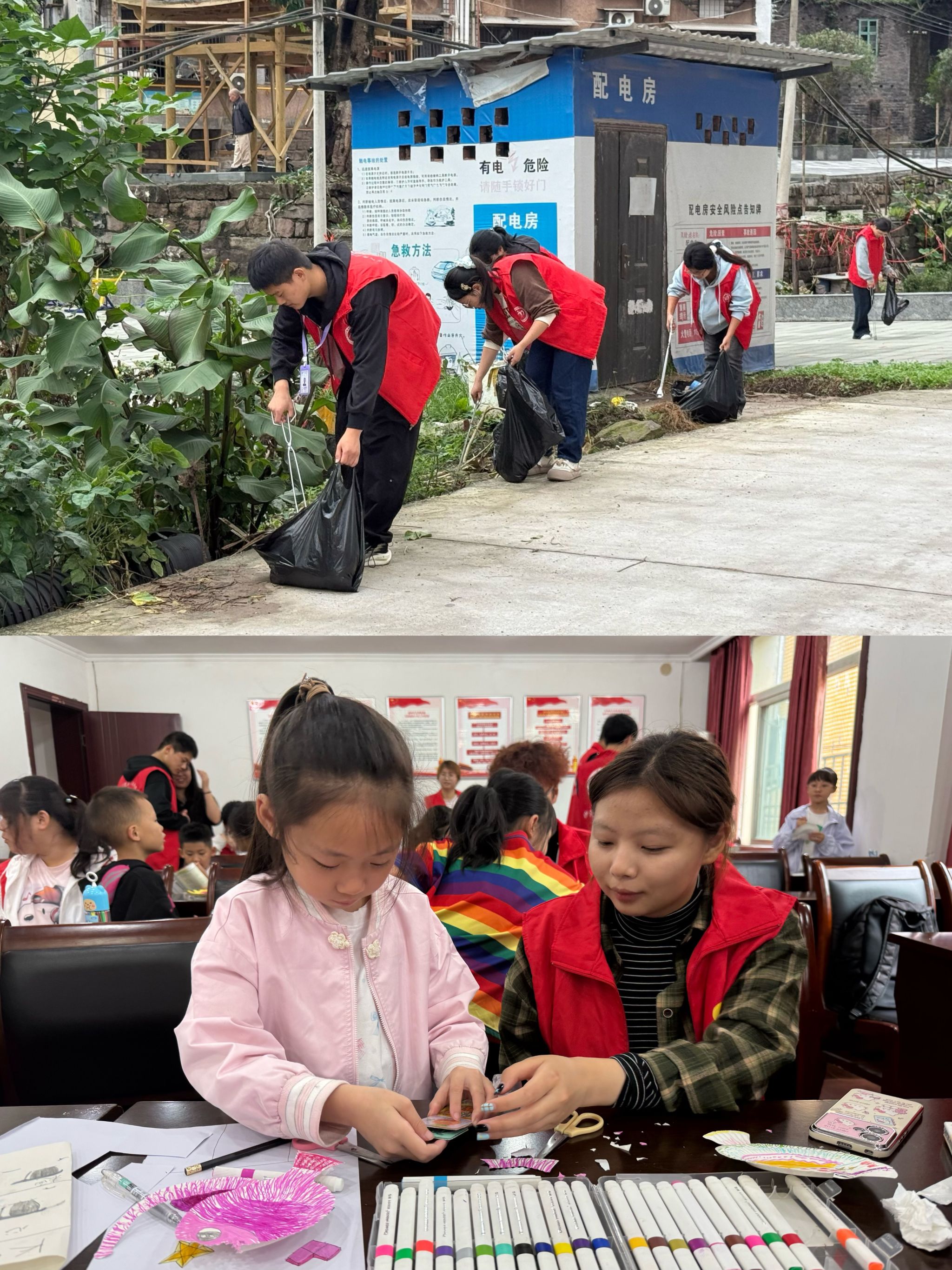 志愿者们分为两组,有序开展志愿服务。第一组志愿者协助小朋友们复习课内知识并完成课程作业。待作业完成后,志愿者们带领小朋友们共同绘制“纸盘小鱼”,让他们亲身体验动手的乐趣,劳逸结合。另一组志愿者携带工具,分工清理社区角落、楼道及周边道路的生活垃圾与杂物,重点整治卫生死角,让环境面貌焕然一新。这一行动不仅改善了社区环境,更有效营造了“人人参与环境保护”的社区氛围。
