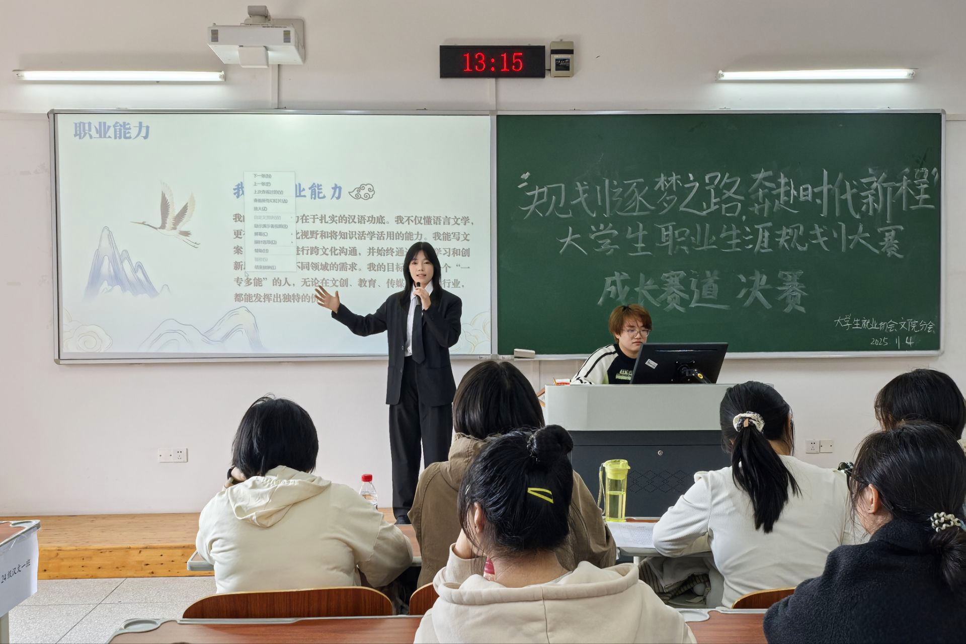 在成长赛道决赛中,永利3044noc团总支(员工)副书记徐梦珂、员工团体联合会主席陈沛洁、员工会主席团成员汤雨欣和何倩受邀担任评委。大赛伊始,主持人介绍到场嘉宾以及比赛规则。随后,参赛选手按抽签顺序依次登台演讲。选手们围绕个人职业规划,从自我认知、职业分析、路径调整等维度,清晰阐述职业目标,充分展现了文院学子对未来职业的清晰认知,彰显了新时代青年立足实际、勇于担当的青春风采。演讲结束后,评委对选手们展现出的就业竞争力、独特职业见解及贴合现实的选择进行了总结点评。