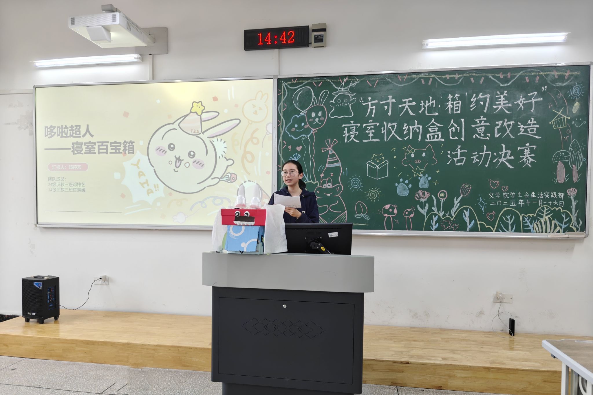 大赛伊始,主持人介绍到场嘉宾以及比赛规则。随后,参赛选手依照抽签顺序依次上台进行作品展示与讲解,呈现了诸多富有创意的收纳盒改造方案。在紧接着的快问快答环节中,同学们积极互动,进一步加深了对环保理念的理解。评委们根据选手表现以及作品细节进行了公正评分。最终,主持人公布比赛结果,并由嘉宾为获奖小组代表颁发奖状,合影留念。