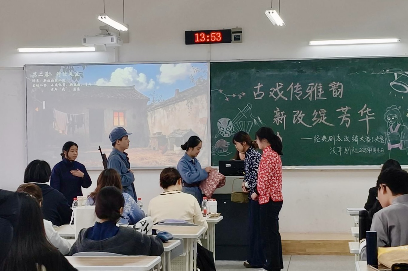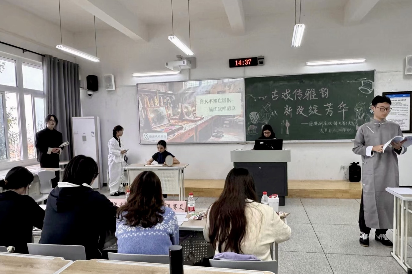11月16日,永利3044noc浅草剧社在博学楼1栋103室举办“古戏传雅韵,新改绽芳华”经典剧本改编大赛决赛。文学级2024级辅导员夏赛岚、员工团体联合会主席陈沛洁、秘书处部长张妍煜、勤工外联部部长张婷婷作为嘉宾评委出席本次活动。