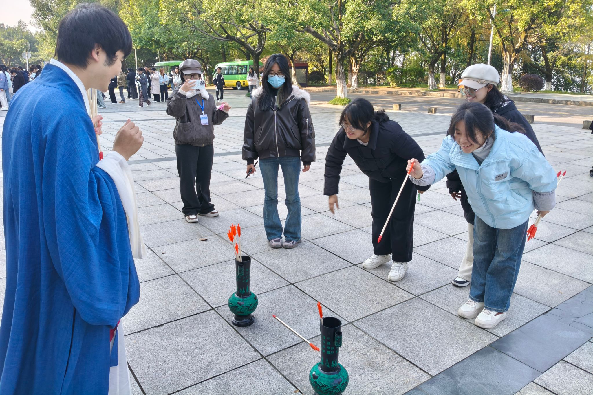 本次游园会精心设置八大趣味关卡,深度融合四社特色。溯源汉服社与三峡诗社带来了“吸盘弓箭”“诗词大富翁”“投壶掷箭”等项目,让同学们在张弓搭箭、掷骰前行、投壶雅戏中沉浸式感受诗词之美与古礼之趣;“抛足戏”则唤起大家对传统民间游戏的温暖记忆。光线轮滑协会与马拉松协会创新设计了“轮滑传笺闯关”“轮滑趣味接力赛”“令牌问答接力”及“逐风跑”环节,将轮滑的灵动、奔跑的激情与诗词历史知识巧妙结合,实现了体力、脑力与团队协作能力的多重锻炼。活动现场,衣袂翩跹的汉服学子与脚踏轮滑、活力飞扬的运动健儿交织往来,古典风雅与现代朝气相映成趣,勾勒出一幅生动多彩的校园文化画卷。