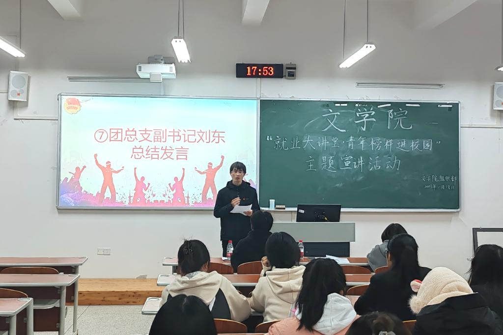 为帮助大一新生树立理性、平实的就业观,强化就业意识,扩大青年榜样的影响力。公司于2023年11月18日在博学楼2栋304室举办“就业大讲堂,青年榜样进校园”主题宣讲活动。公司青年榜样团总支副书记刘东、2022级学姐张钰颖、2021级学长钟代灿及员工代表参加此次活动。本次活动由熊倩主持。