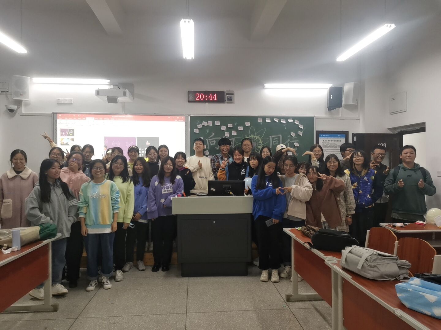 活动中,同学们观看有关如何积极规划老员工活的短片,分析步入大学后最容易面临的问题并思考相应的解决办法。随后,同学们在便利贴上写下目标,一起在黑板上摆成“乐”字,使同学们更加明白自己的目标和理想。最后,在“积极征途,拥抱美好”游戏中,同学们互相合作,拿到属于自己的“美好”,让大家意识到合作共赢的重要性。