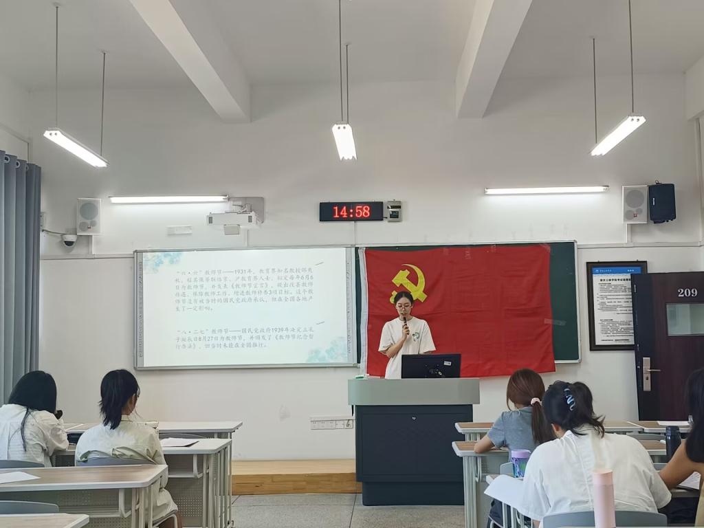 活动伊始,党员代表王雪琴和任荟杉同志进行领学。王雪琴同志带领大家认真学习了习近平总书记在2024年全国教育大会的讲话精神,让大家深刻领会到了教育对于国家发展的重要意义以及党和国家对教育事业的高度重视。任荟杉同志以尊师重道是中华民族的优良传统为切入点,带领党员同志们了解了教师节的发展演变,并强调要尊重和感恩教师,进一步激发党员对教师的敬重之情和感恩之心。