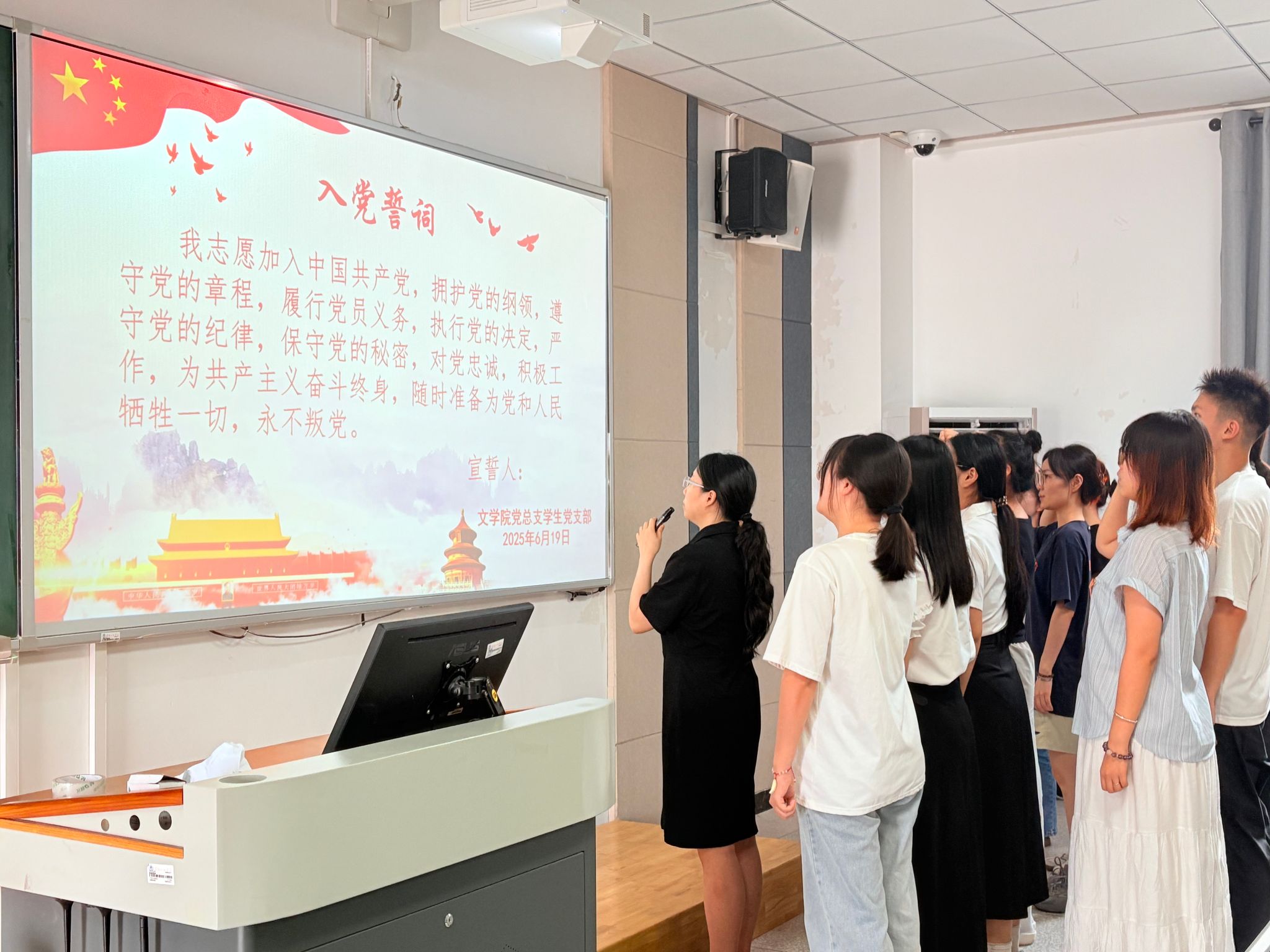 周子钦站于前方,右手握拳举过肩头,面向党旗,带领第18期预备党员宣读入党誓词。她表示,今天新一批同志光荣加入党组织。从这一刻起,你们的肩上多了一份沉甸甸的责任。入党誓词的每一字、每一句,都凝结着共产党人的初心与使命。希望你们以优秀党员同志为榜样,主动学习党的理论,在实践中锤炼本领,用实际行动诠释“请党放心,强国有我”的青春誓言。
